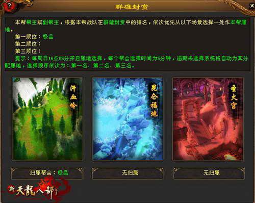 属地分别为:昆仑福地、圣火宫和汗血岭。为了夺得这样的属地发展自己帮会的实力,各路英雄豪杰都在跃跃欲试!这不仅是一个优势,更是一种荣耀,一种实力的标志。